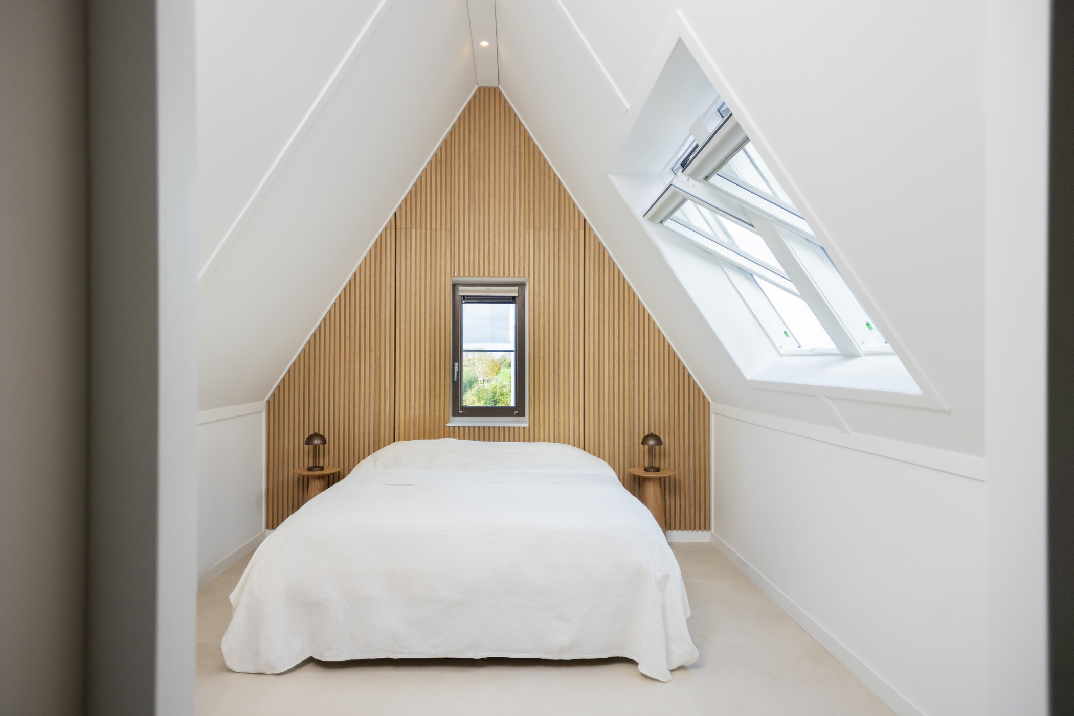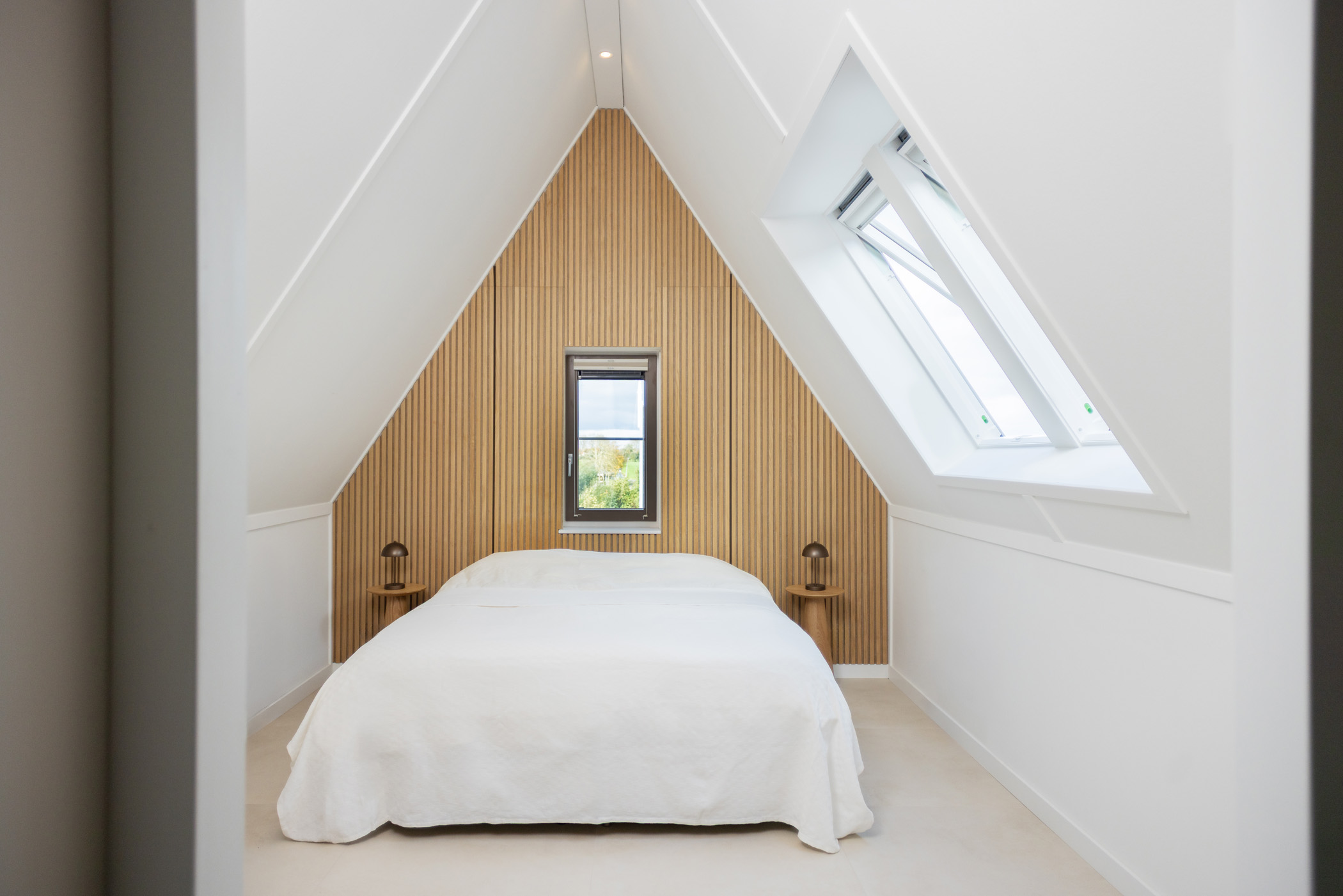 Met twee uitzettuimeldakramen is één deel van de zolder omgetoverd tot een heerlijke slaapkamer.
